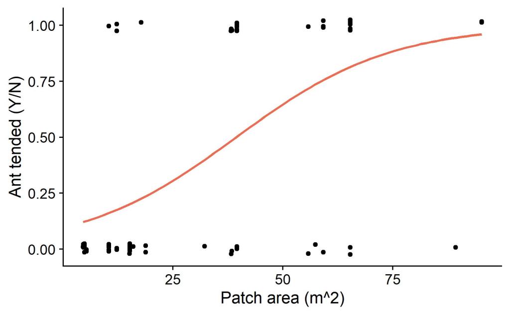 We used a model selection approach to sort out which of the abiotic and biotic factors were associated with ant tending. To fit these models, we combined monitoring data from 2020 through 2021. The model that was the closest match to the data included the explanatory variables of larvae per bine, patch area, and phenological stage of the hops flowers. We found that the likelihood of ant tending increased with the number of larvae per bine. Similarly, the likelihood of ant tending increased with the area of the hops patch. This may be simple density dependence whereby ants concentrate their foraging where larvae are most abundant. Lastly, larvae on later stage flowers were more likely to be tended by ants. We explored this last result more with several laboratory assays. We presented our results as a poster at the 2021 Entomological Society of America Meeting.